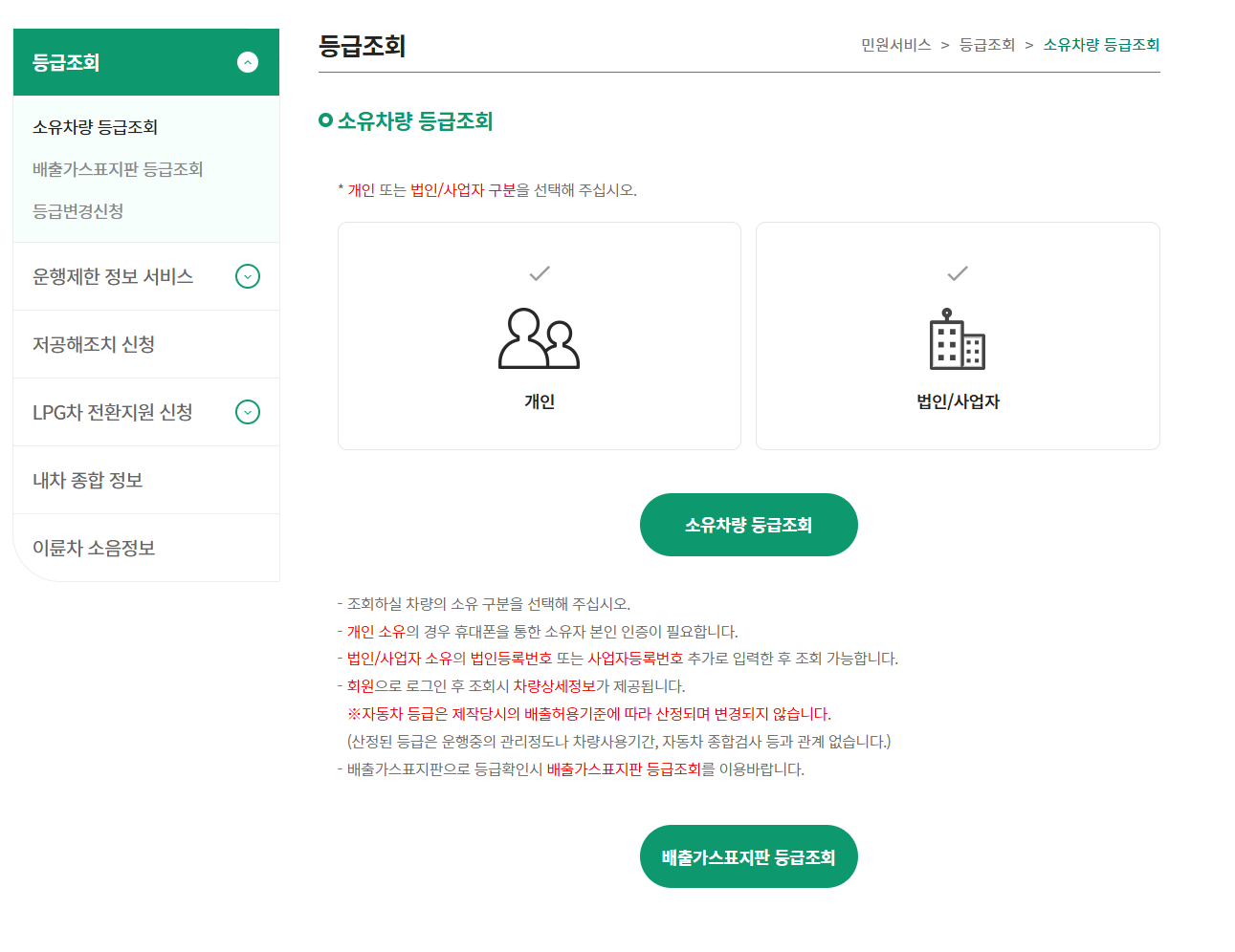 차량번호와 차대번호만 입력하면 배출가스 등급, 규제 대상 여부, 지원금 대상 여부까지 확인할 수 있습니다.