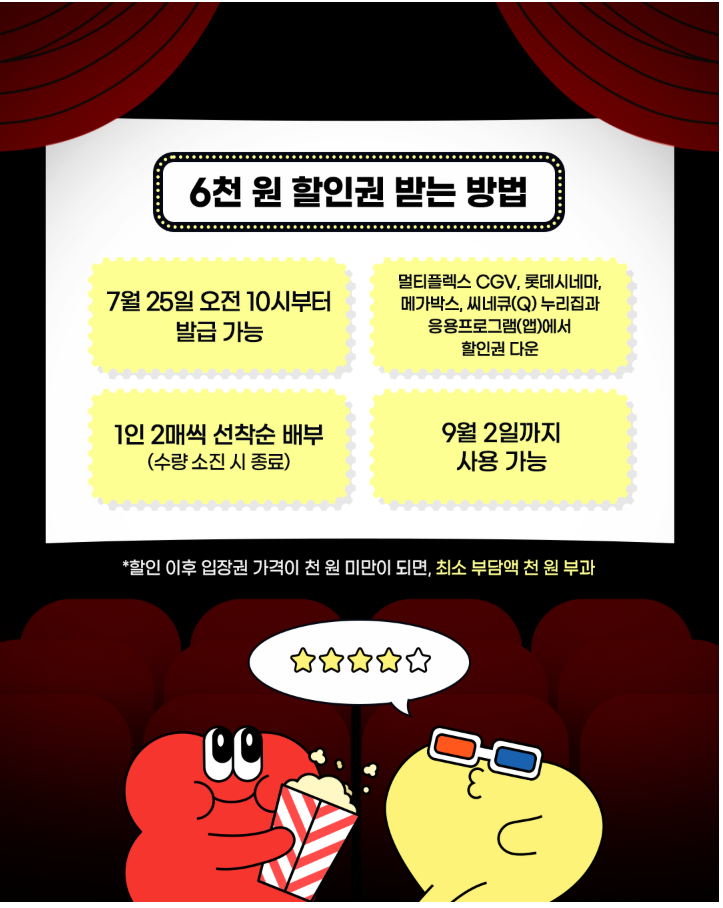 - 2025년 7월 25일 오전 10시부터, 각 극장 앱 또는 웹에서 할인권 신청