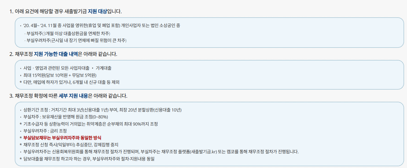 새출발기금은 2020년 4월 ~ 2024년 11월 사이 사업을 했던 개인사업자 또는 법인 소상공인의 채무를 조정해주는 금융지원 제도입니다.