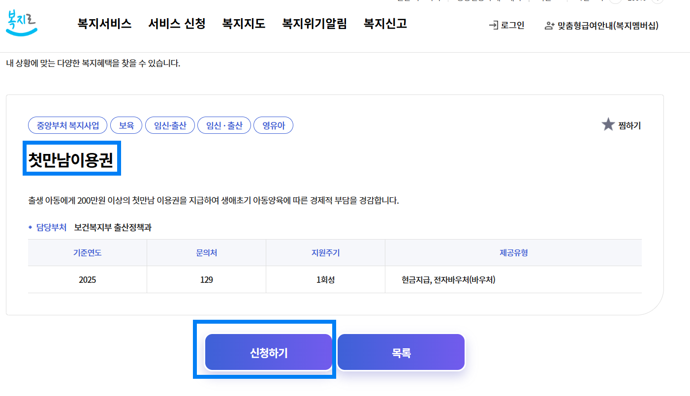 - ‘첫만남이용권 신청’ 메뉴 선택