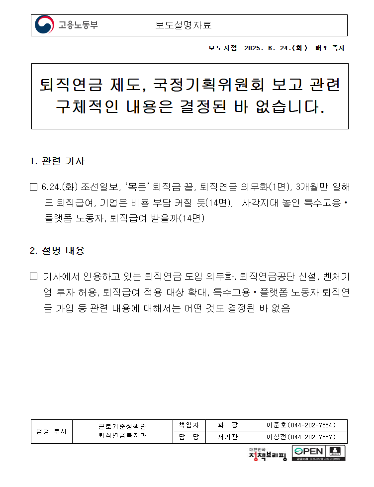 2025년 6월 24일, 고용노동부는 ‘퇴직연금 제도, 국정기획위원회 보고 관련 구체적인 내용은 결정된 바 없다’는 보도설명자료를 통해 현재 언론 보도 내용을 공식적으로 부인했습니다. 특히 조선일보 보도와 관련된 다음과 같은 내용은 아직 정부 차원에서 확정되지 않았습니다.