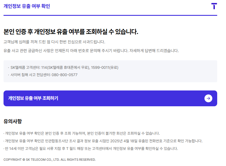👉 T월드 앱 또는 SKT 고객센터(114)를 통해 유출 여부 조회 가능합니다.